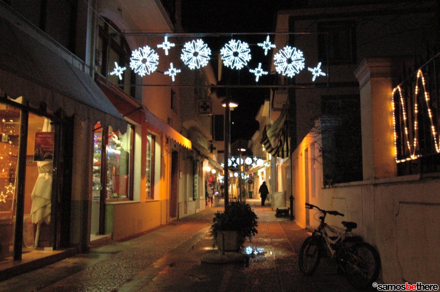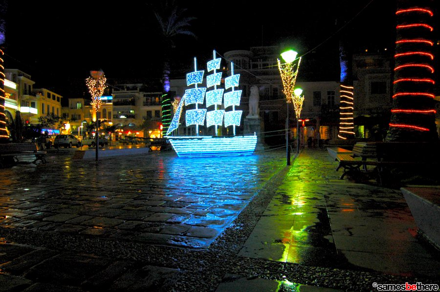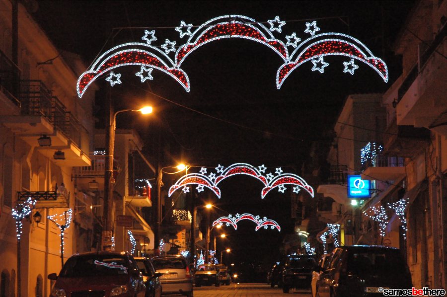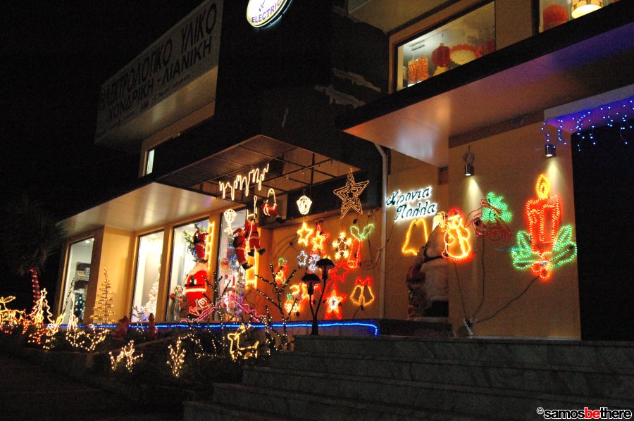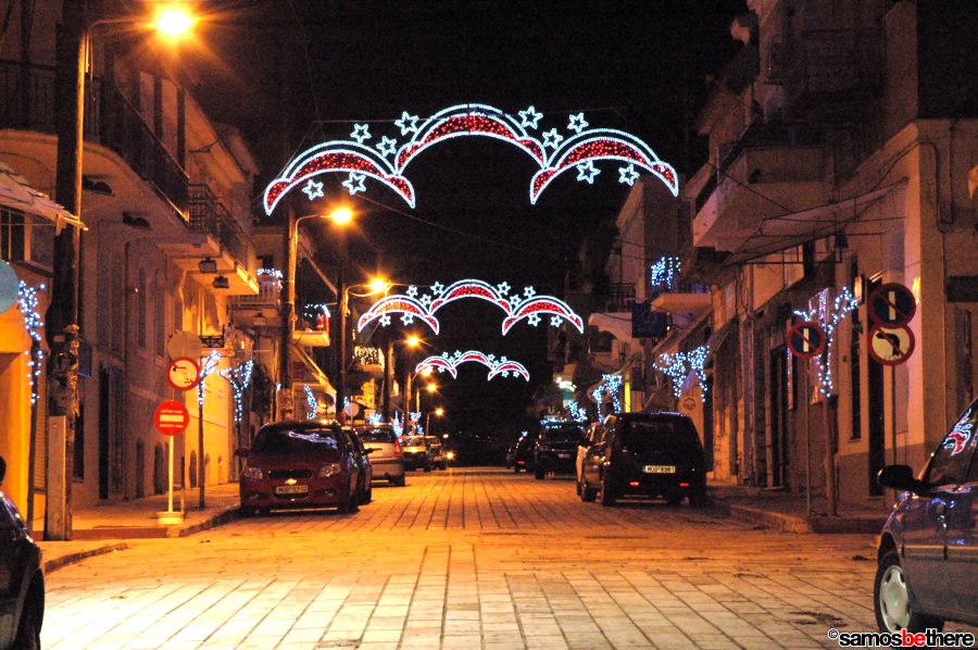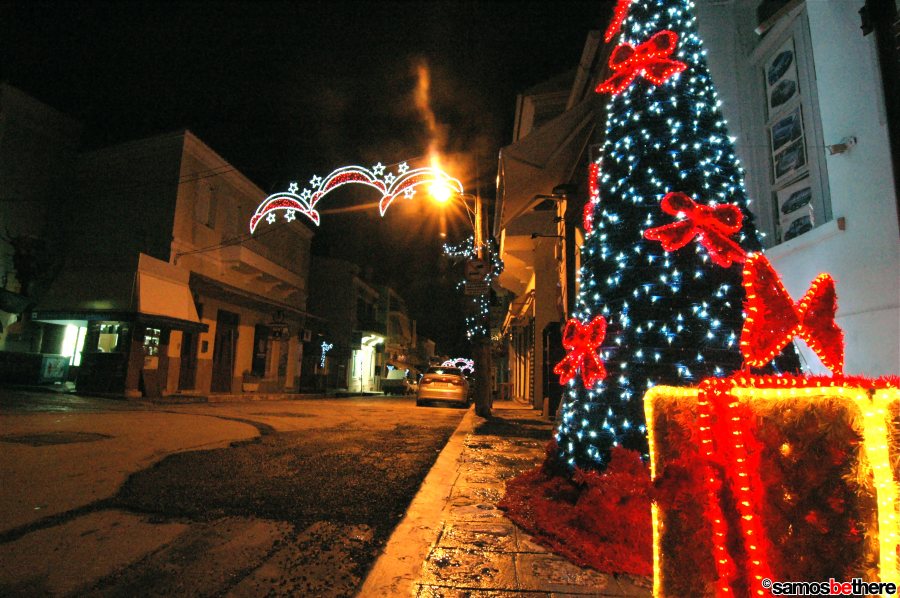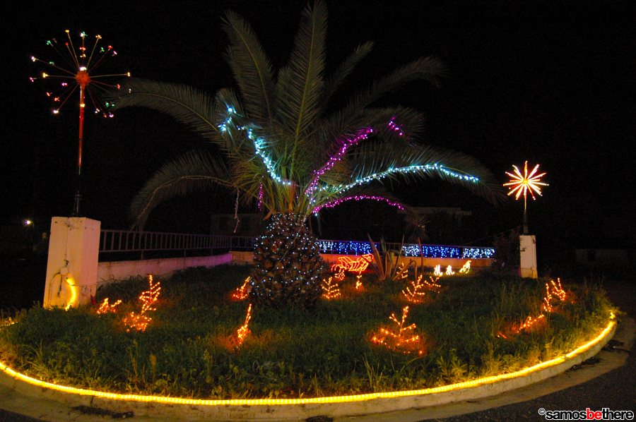 No snow or dreaming of a white Christmas, but colorful lights all over Samos.