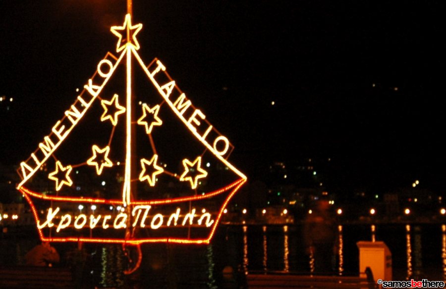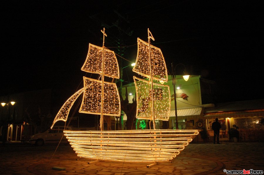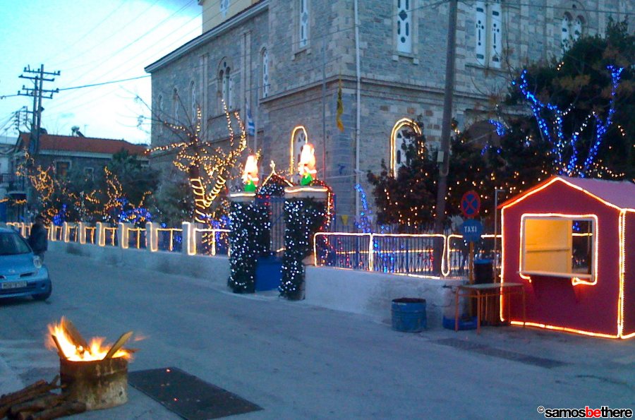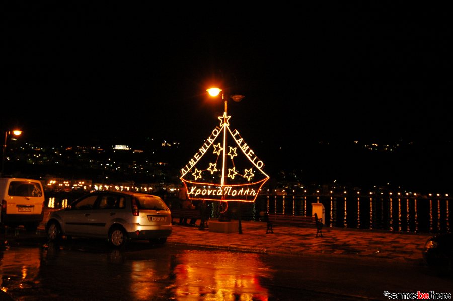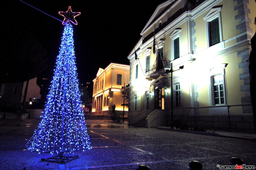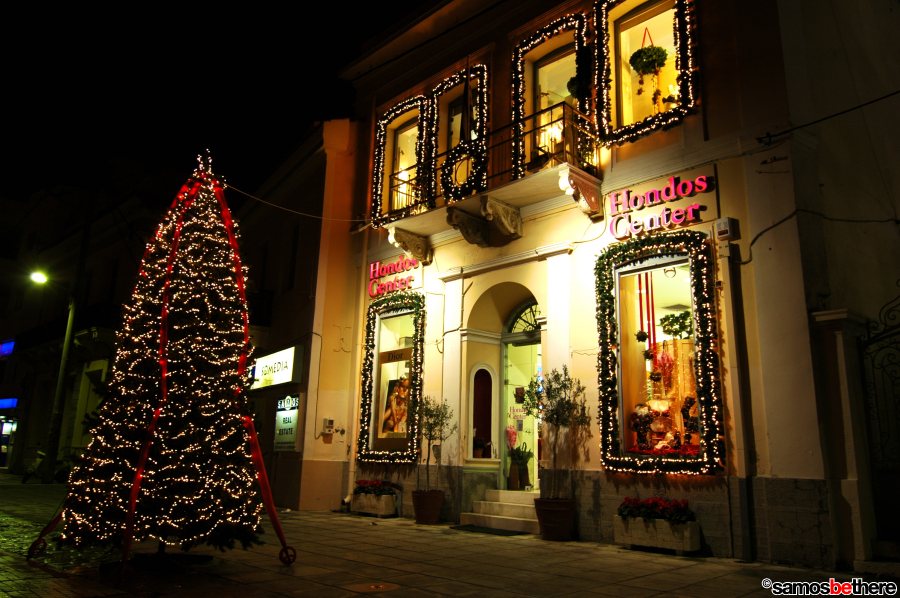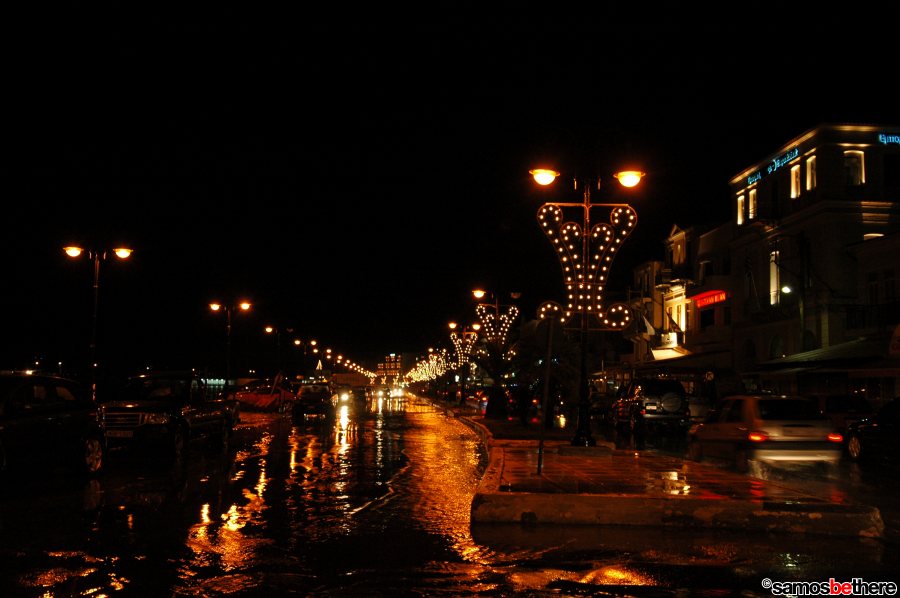 No snow or dreaming of a white Christmas, but colorful lights all over Samos.