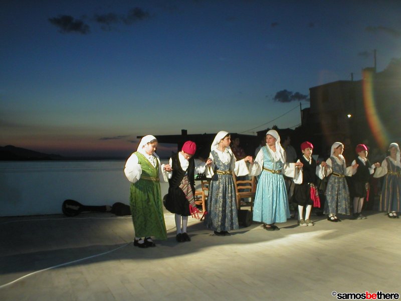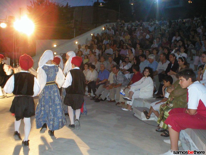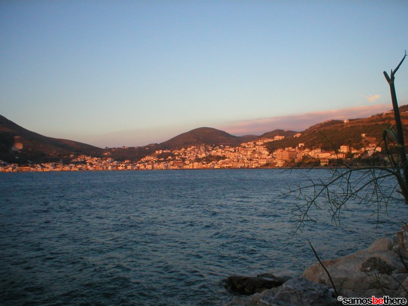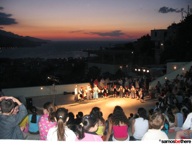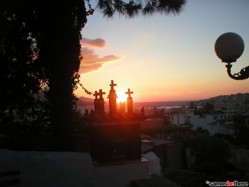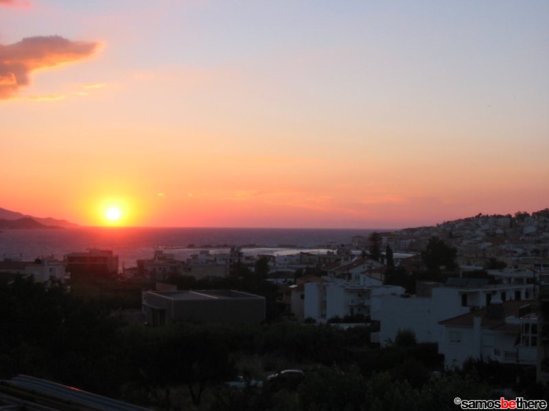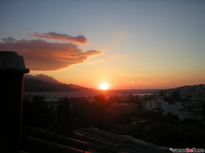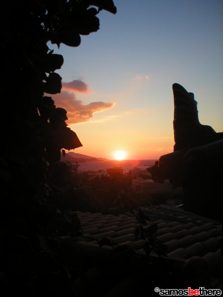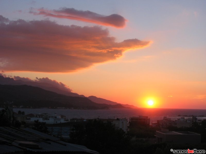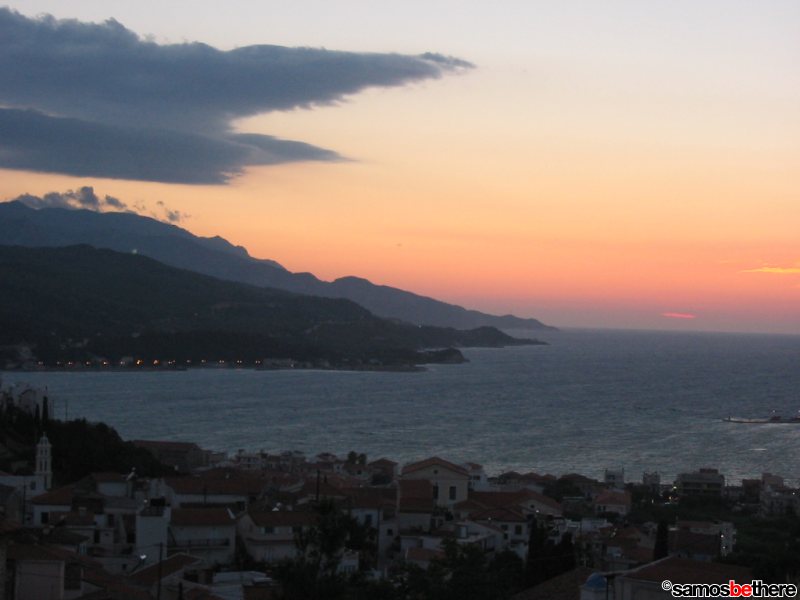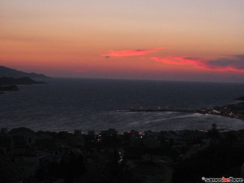 Samos sunset at the day of the celebration of Agios Ioannis Klydonas 2004, with traditional dances and music at the theatre of Ano Vathi. (Samos-town) |